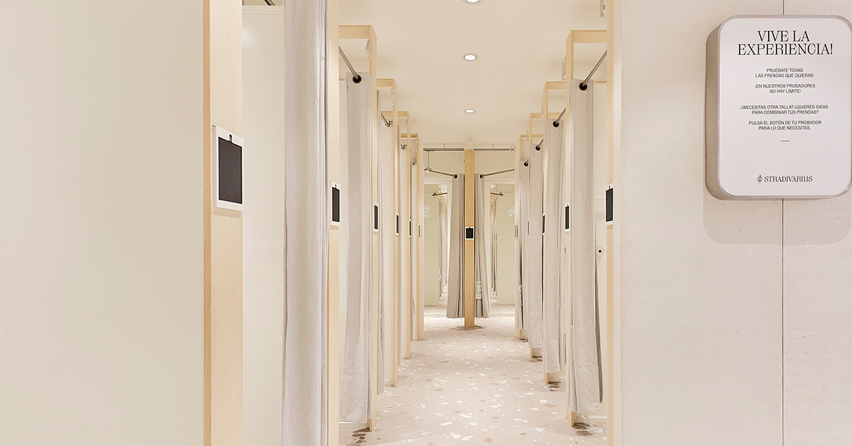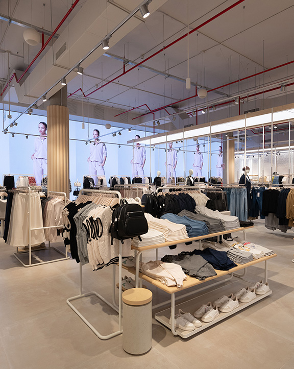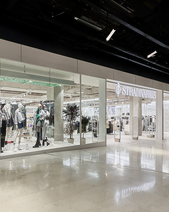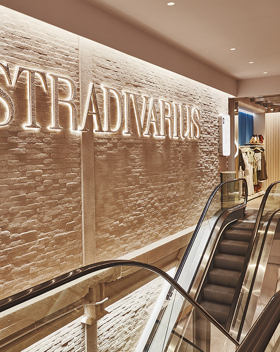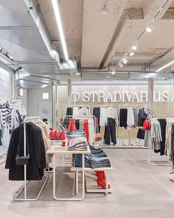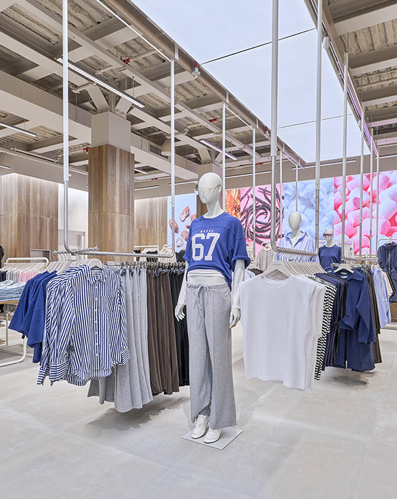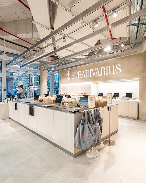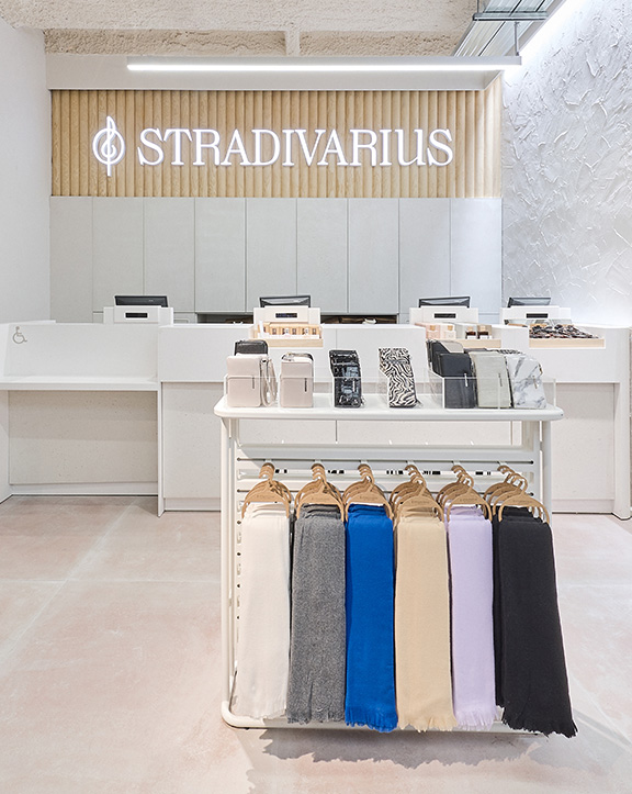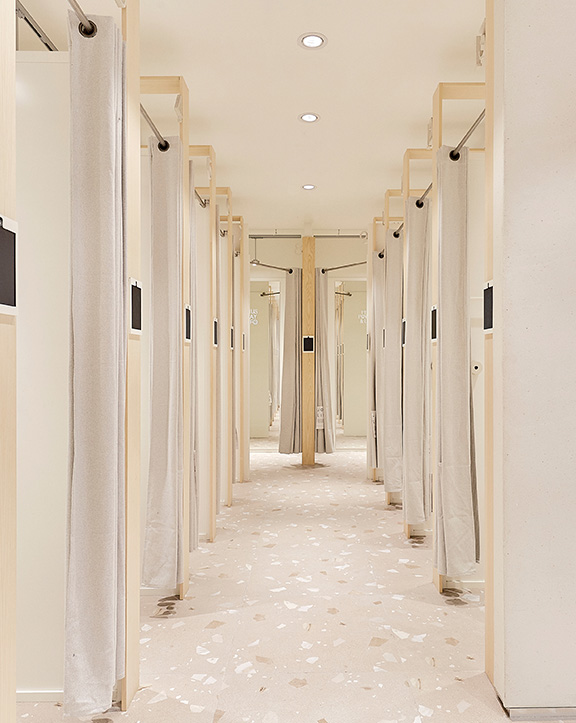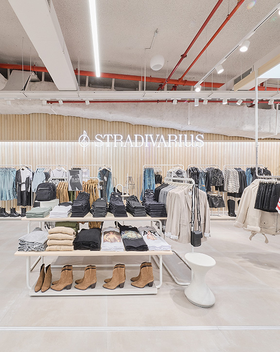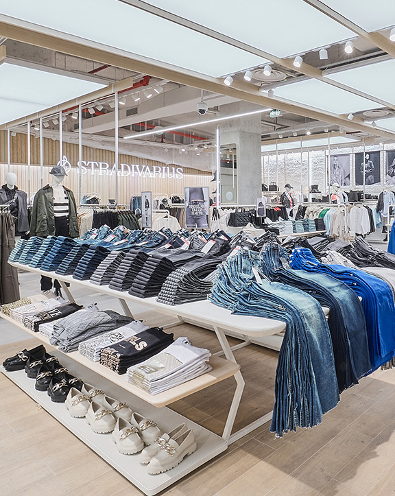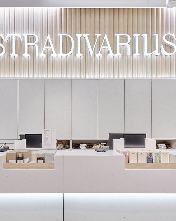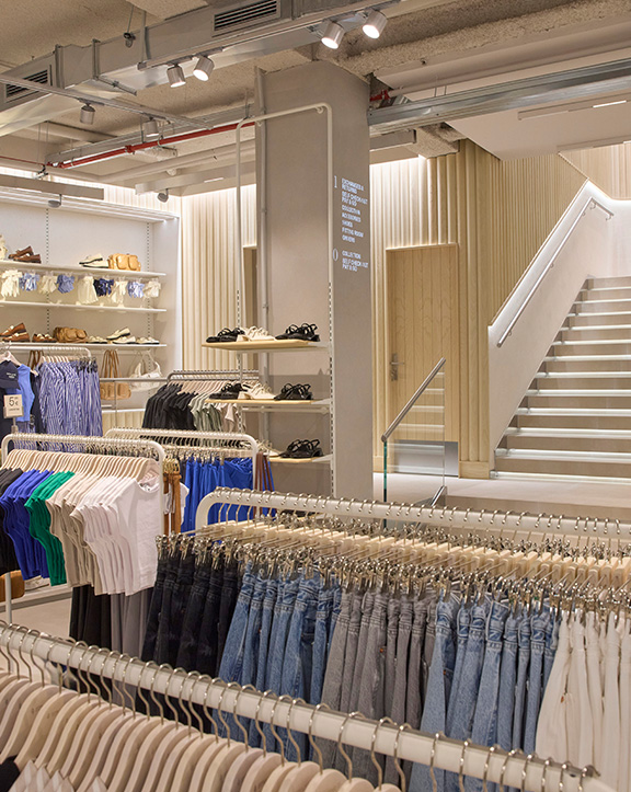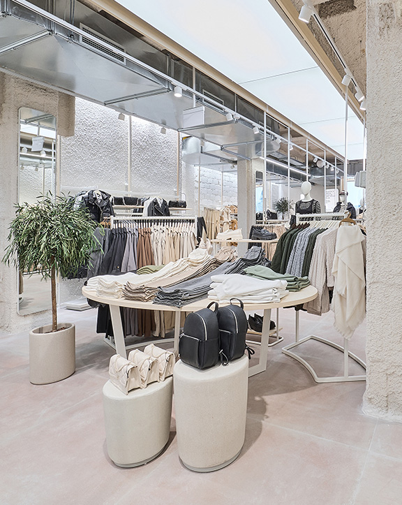 Sus muebles colgantes crean un espacio limpio en el que las colecciones toman todo el protagonismo. Cabe destacar la apuesta por los materiales naturales y la iluminación LED, en línea con los criterios ecoeficientes del Grupo Inditex.