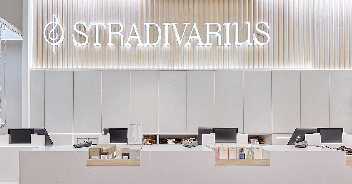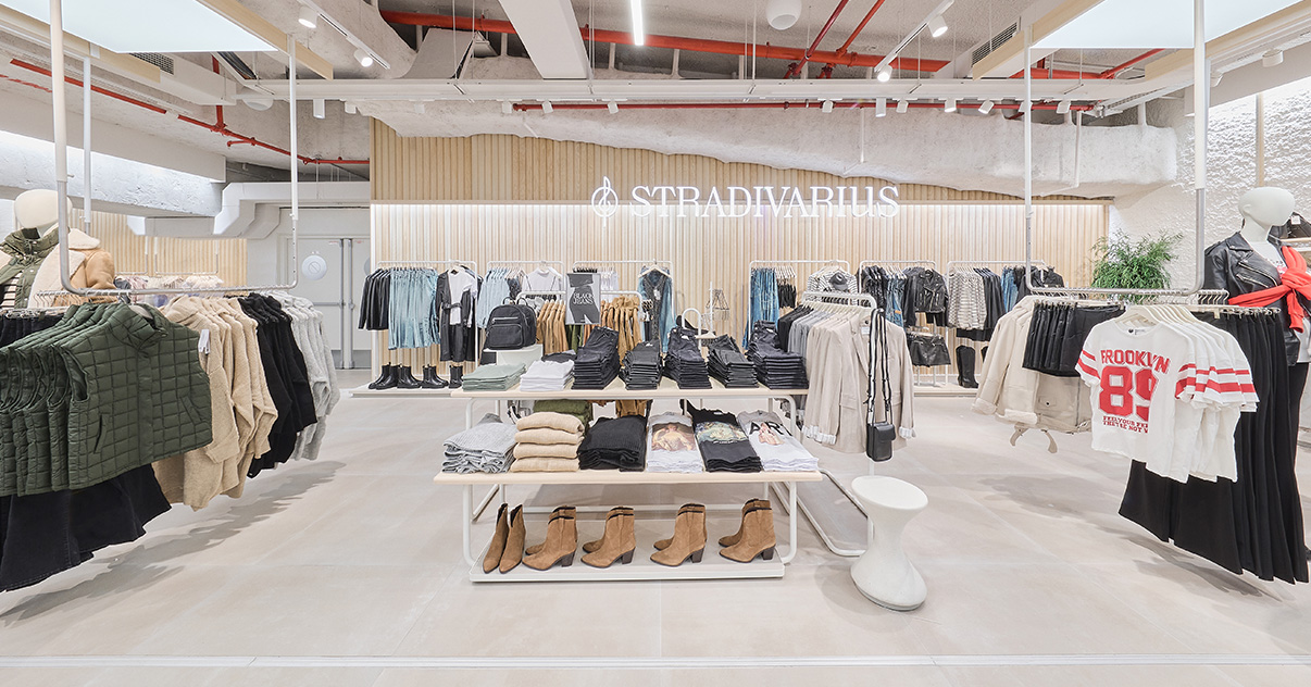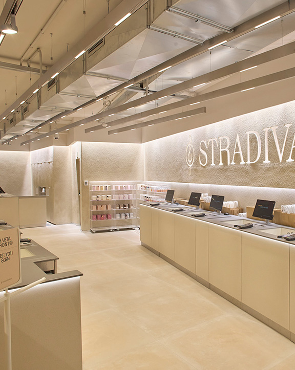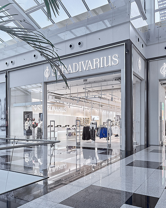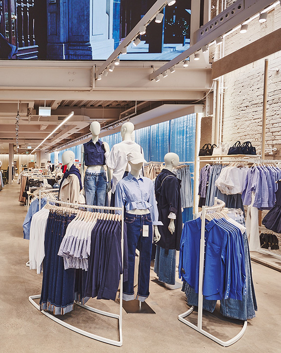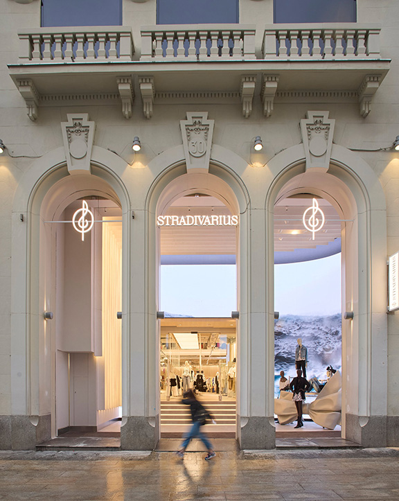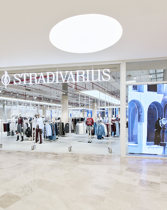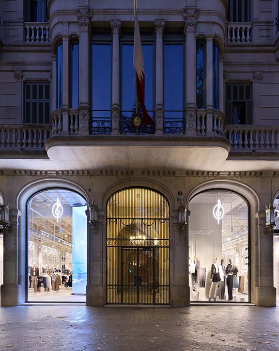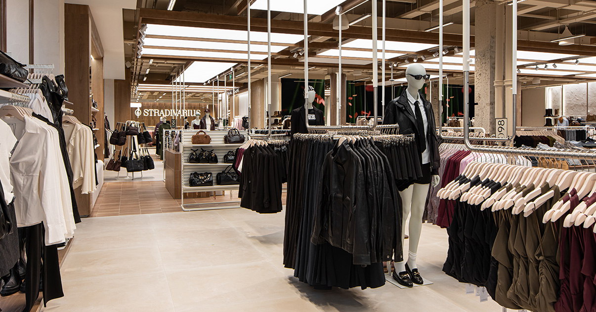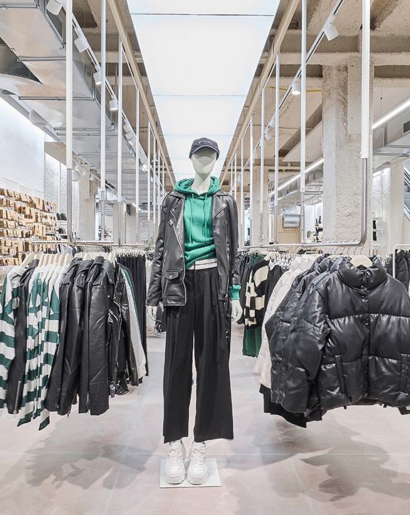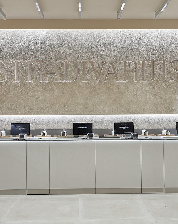 Sus muebles colgantes crean un espacio limpio en el que las colecciones toman todo el protagonismo. Cabe destacar la apuesta por los materiales naturales y la iluminación LED, en línea con los criterios ecoeficientes del Grupo Inditex.