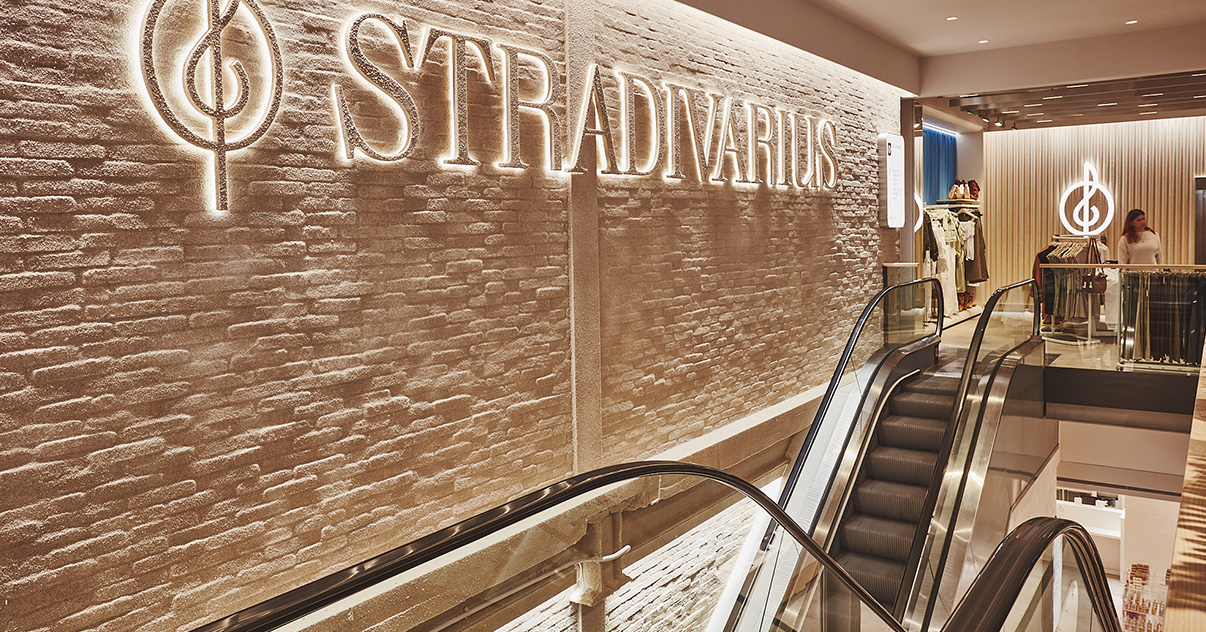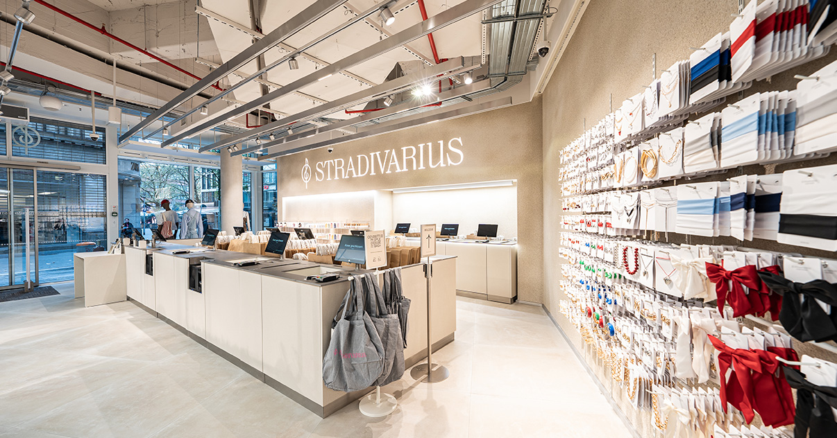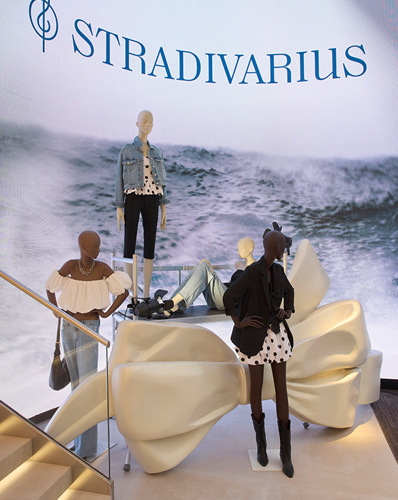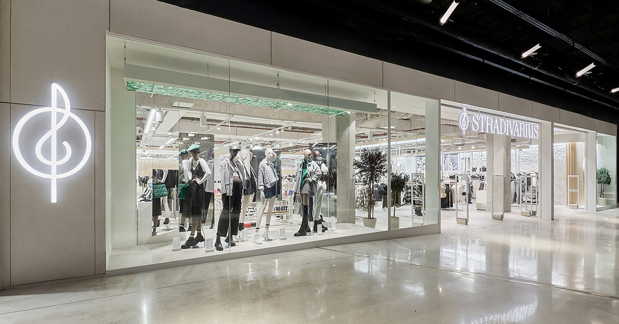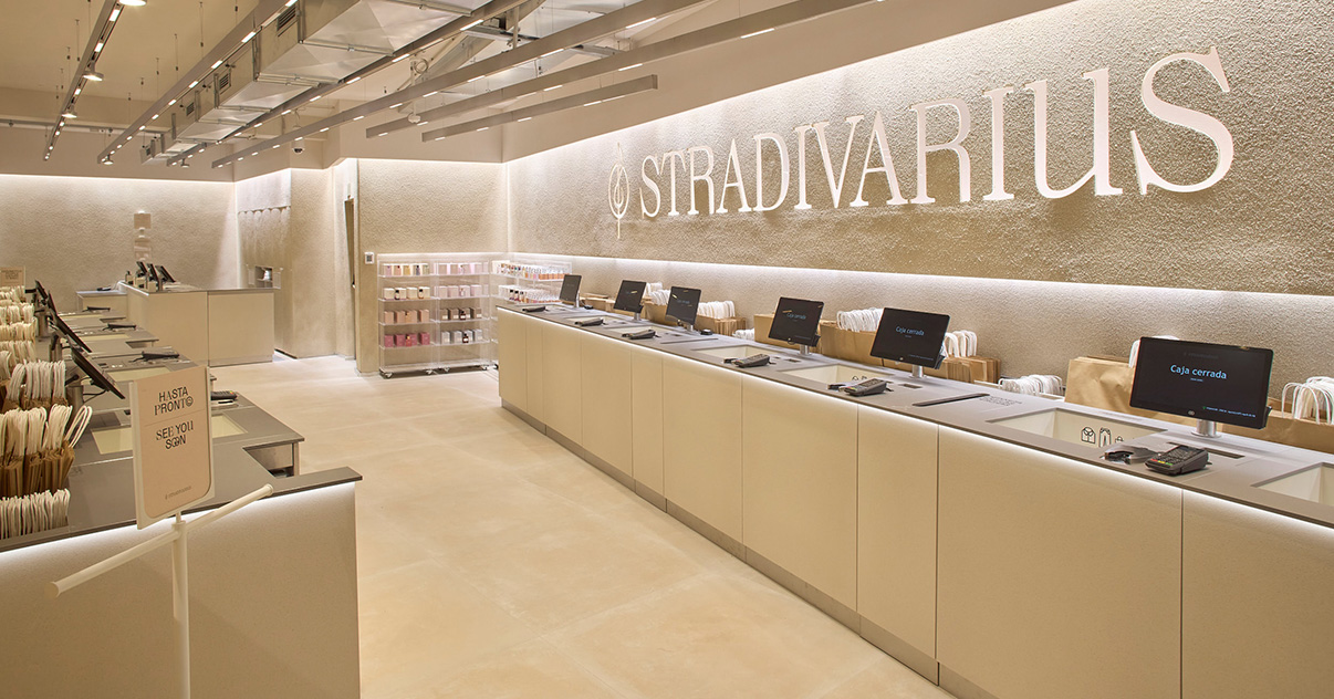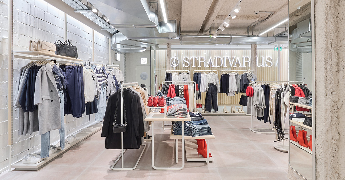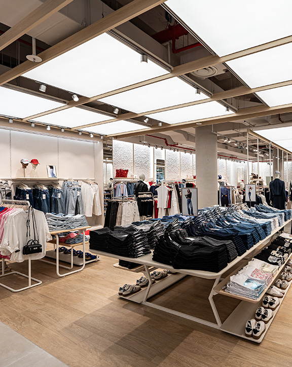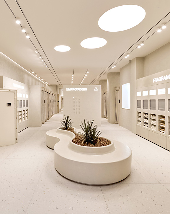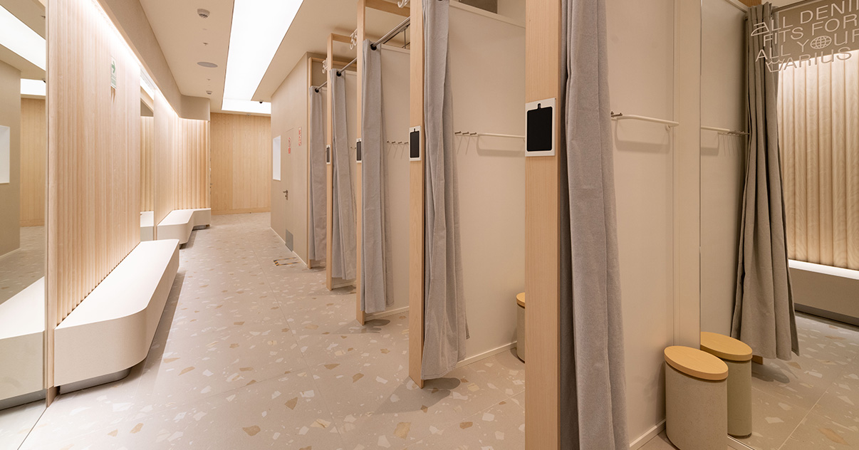 Sus muebles colgantes crean un espacio limpio en el que las colecciones toman todo el protagonismo. Cabe destacar la apuesta por los materiales naturales y la iluminación LED, en línea con los criterios ecoeficientes del Grupo Inditex.