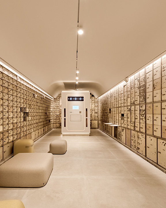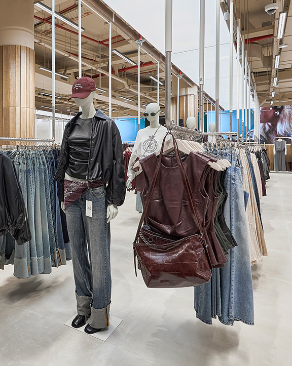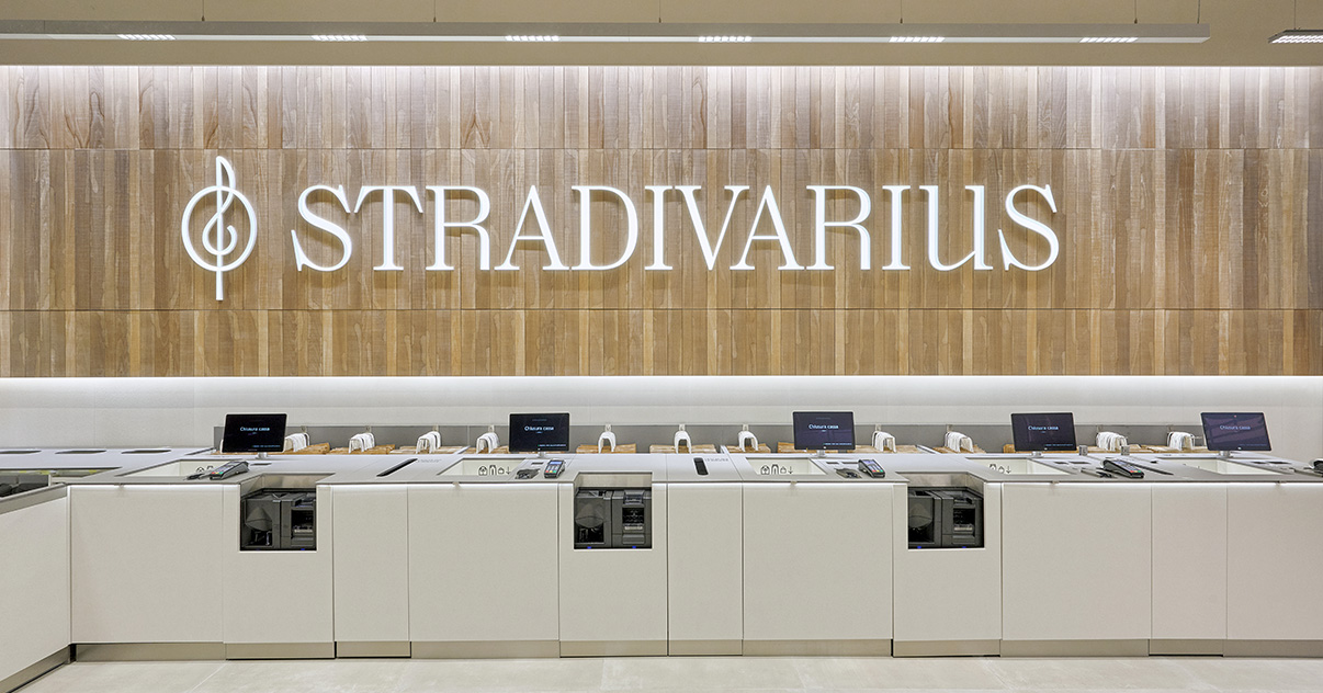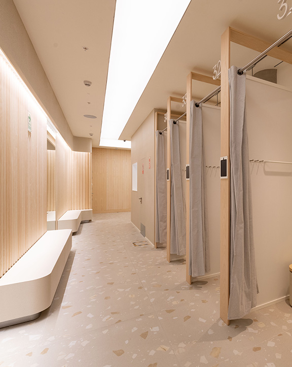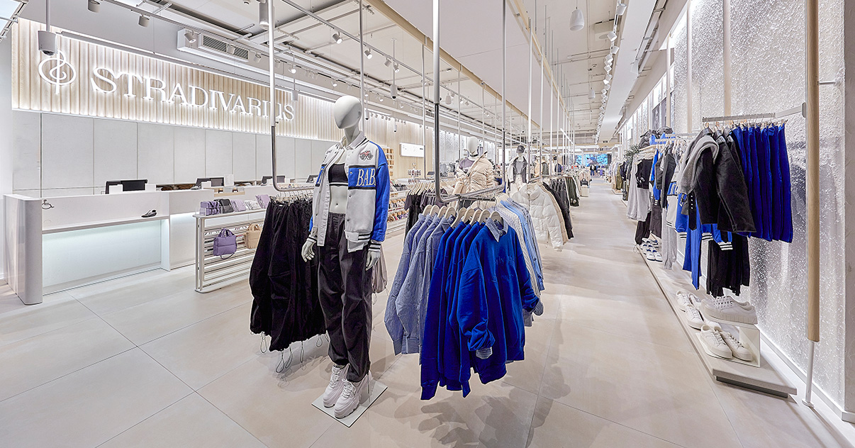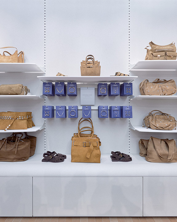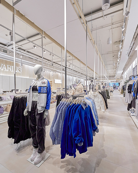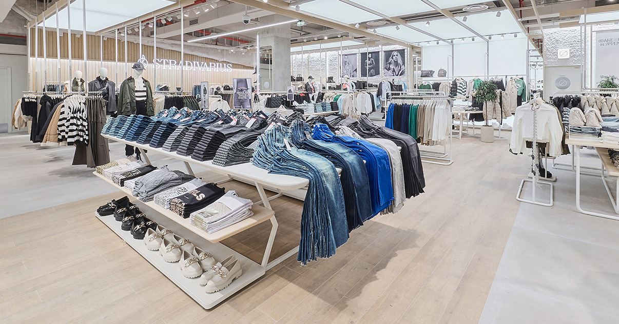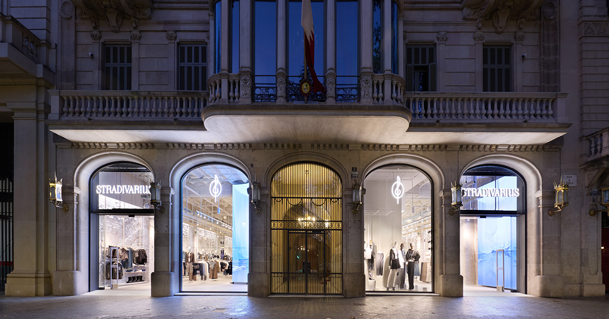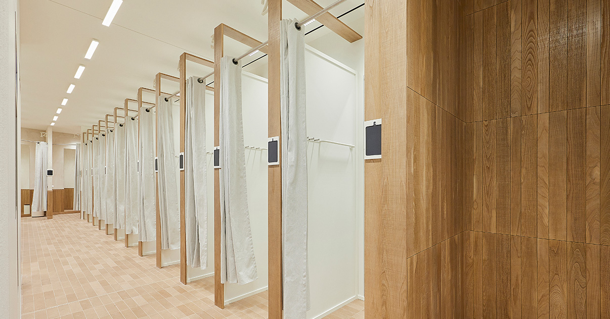 Sus muebles colgantes crean un espacio limpio en el que las colecciones toman todo el protagonismo. Cabe destacar la apuesta por los materiales naturales y la iluminación LED, en línea con los criterios ecoeficientes del Grupo Inditex.